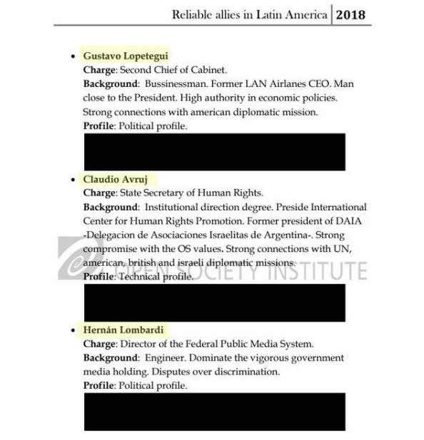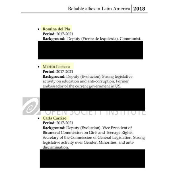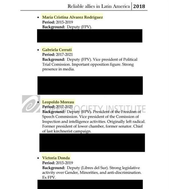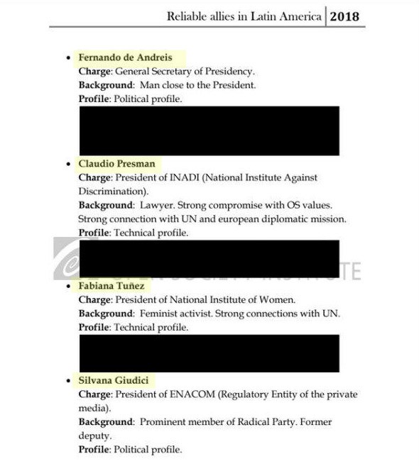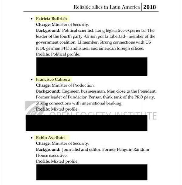 Son presentados como “reliable allies in Latin America” o sea, “aliados confiables en América Latina” de la Open Society de Soros y clasificados como “Trustable leaders for OSF & OSI LR1” o sea “líderes confiables para la Open Society Foundations”, siendo LR1 “referentes argentinos comprometidos con los valores de la Open Society Foundations y dispuestos a colaborar en el desarrollo legislativo y nueva normativa”.
